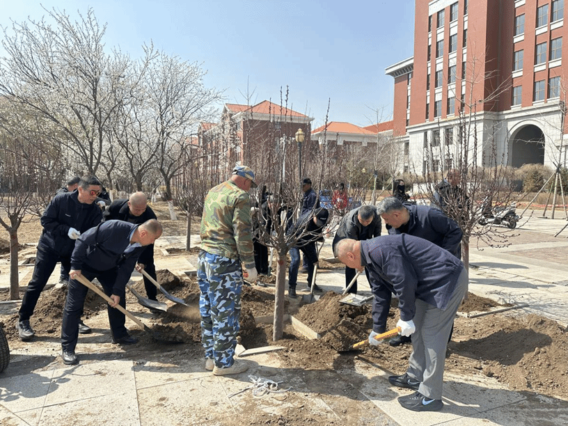 活动现场气氛热烈、秩序井然。全体人员精神饱满、干劲十足,分工协作、配合默契,挥锹铲土、扶苗培土、提桶浇水,严格按照植树规范认真完成每一道工序。大家以严谨细致、求真务实的作风,确保棵棵苗木栽稳栽实,展现出总务后勤人团结奋进、踏实肯干的精神风貌。一锹土,夯实的是绿色根基;一桶水,浇灌的是生机希望。全体党员干部不怕辛苦、奋勇争先,在劳动中践行初心使命,在汗水中诠释担当奉献,于协作中凝聚团队力量,于实干中锤炼党性修养,生动彰显了后勤队伍吃苦耐劳、务实进取的优良作风。经过共同努力,新栽树苗迎风挺立、错落有致,在融融春晖中焕发出勃勃生机,成为校园一道崭新的风景线,为春日校园增添了鲜活绿意与美好希望。